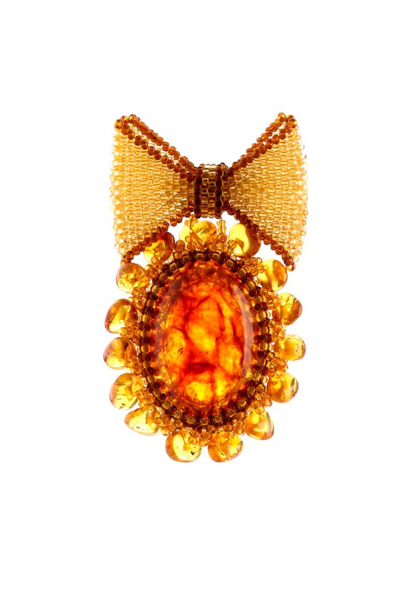 Брошь выполнена в технике бисероплетения. Декорирована с натуральным янтарем. Состав: бижутерный сплав, размеры: 7 х 6 см., вес: 25,5 г.
