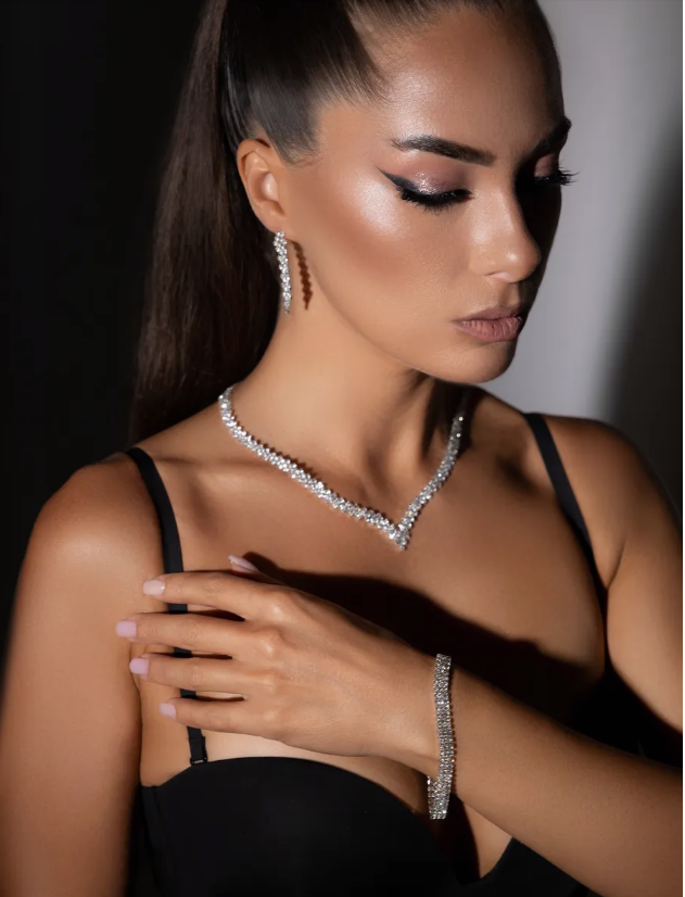 Женский набор ювелирной бижутерии включает в себя колье из страз, длинные серьги гвоздики и стильный браслет со стразами в стиле Сваровски.
