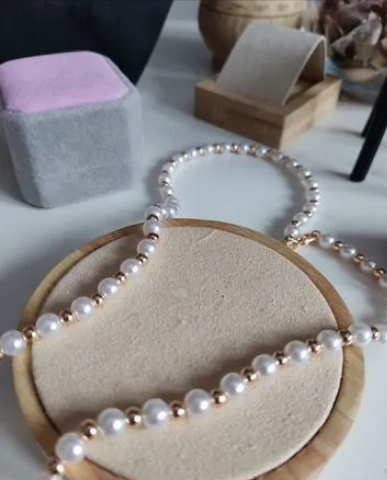 Бусы с искусственным жемчугом ,диаметр жемчужин 6мм.Другие шарики покрыты слоем золота 585 пробы,который накатьвается и направляется (это придает прочность )
