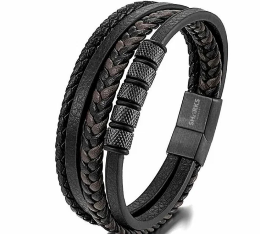 Плетеный кожанный браслет с металлическими пряжками очень стильно и модно смотрится на руке.
