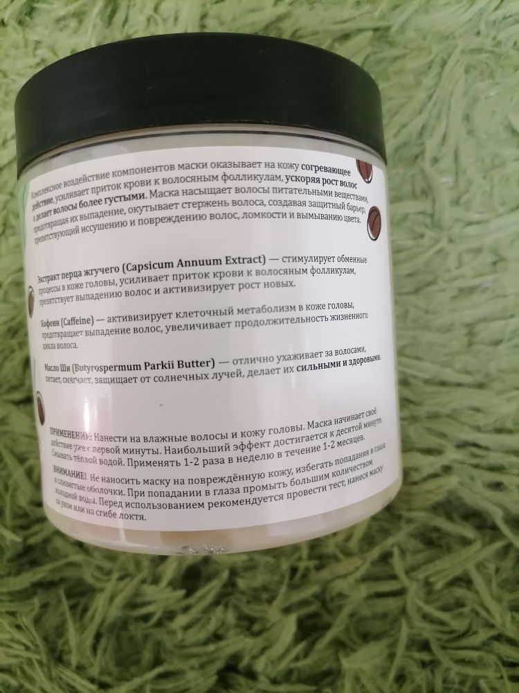 Маска оказывает согревающее действие, ускоряя рост волос. Волосы становятся густыми. Содержит экстракт перца жгучего, кофеин, масло Ши.