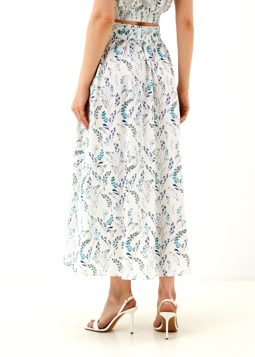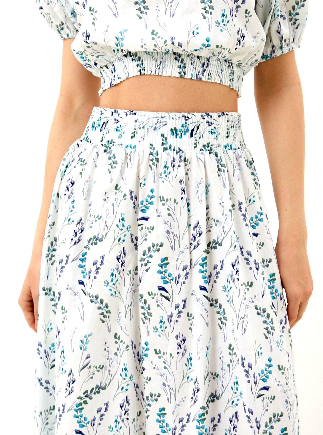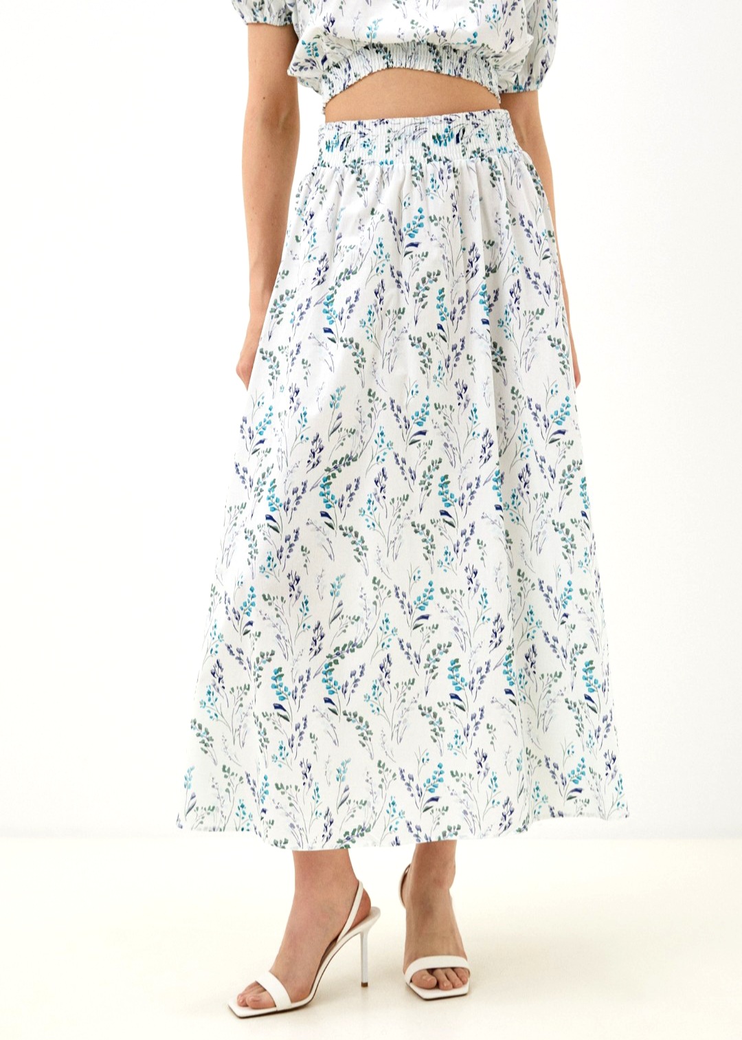 Лёгкая летняя тонкая женская юбка- трапеция . Белого цвета без застёжки, цветочным узором. Изготовленная из хлопковой ткани.