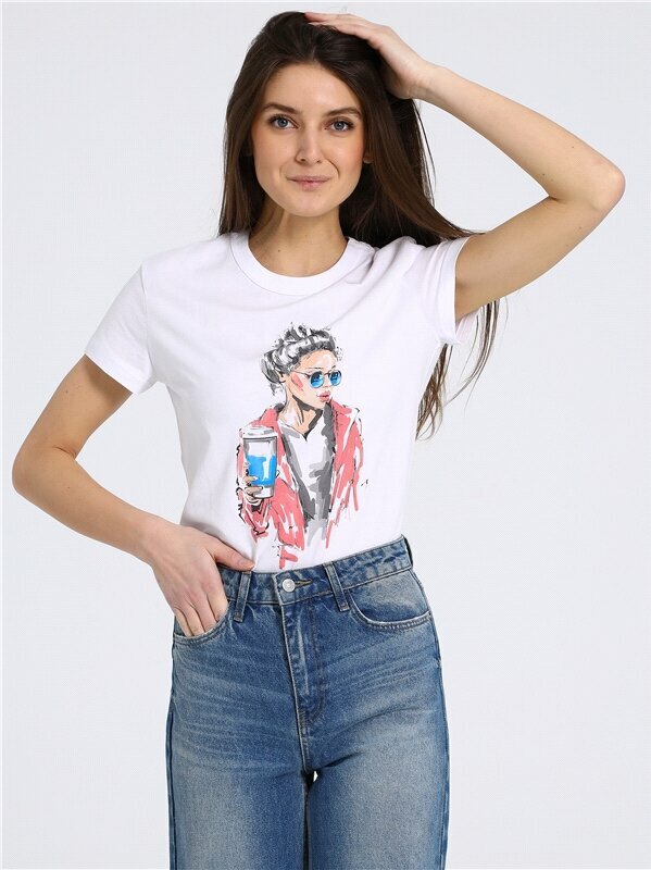 Белая футболка с принтом "девушка с кофе". Футболки с красочными арт- принтами легко вписываются в повседневные образы. Состав 100% хлопок, размер 48.