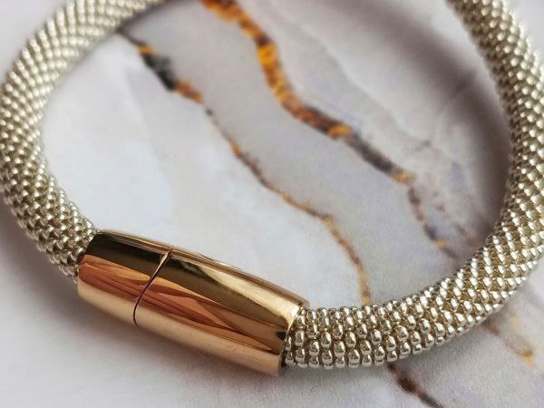Женский браслет, очень красивый и удобный. Механический замок с защелкой (закрывается до щелчка, одной рукой, а открывается нажатием на кнопку сверху). Материал - сталь, очень долговечные застежки.