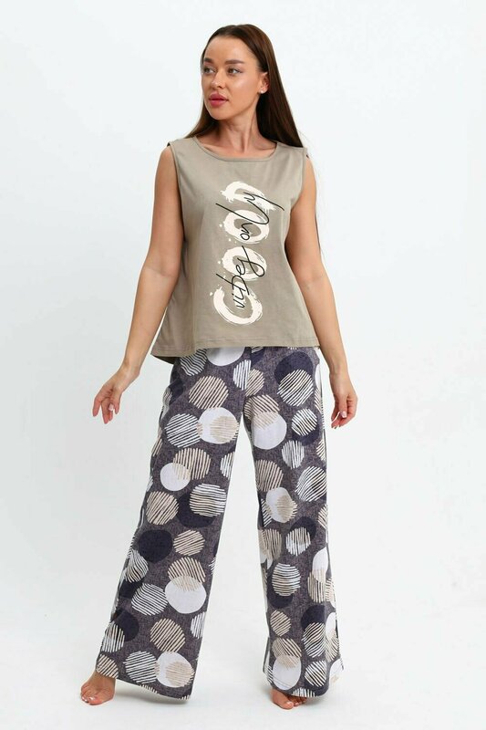 Комплект состоит из брюк и майки, бежевого цвета, размер 50. Брюки свободного кроя с карманами, майка на широких бретелях.