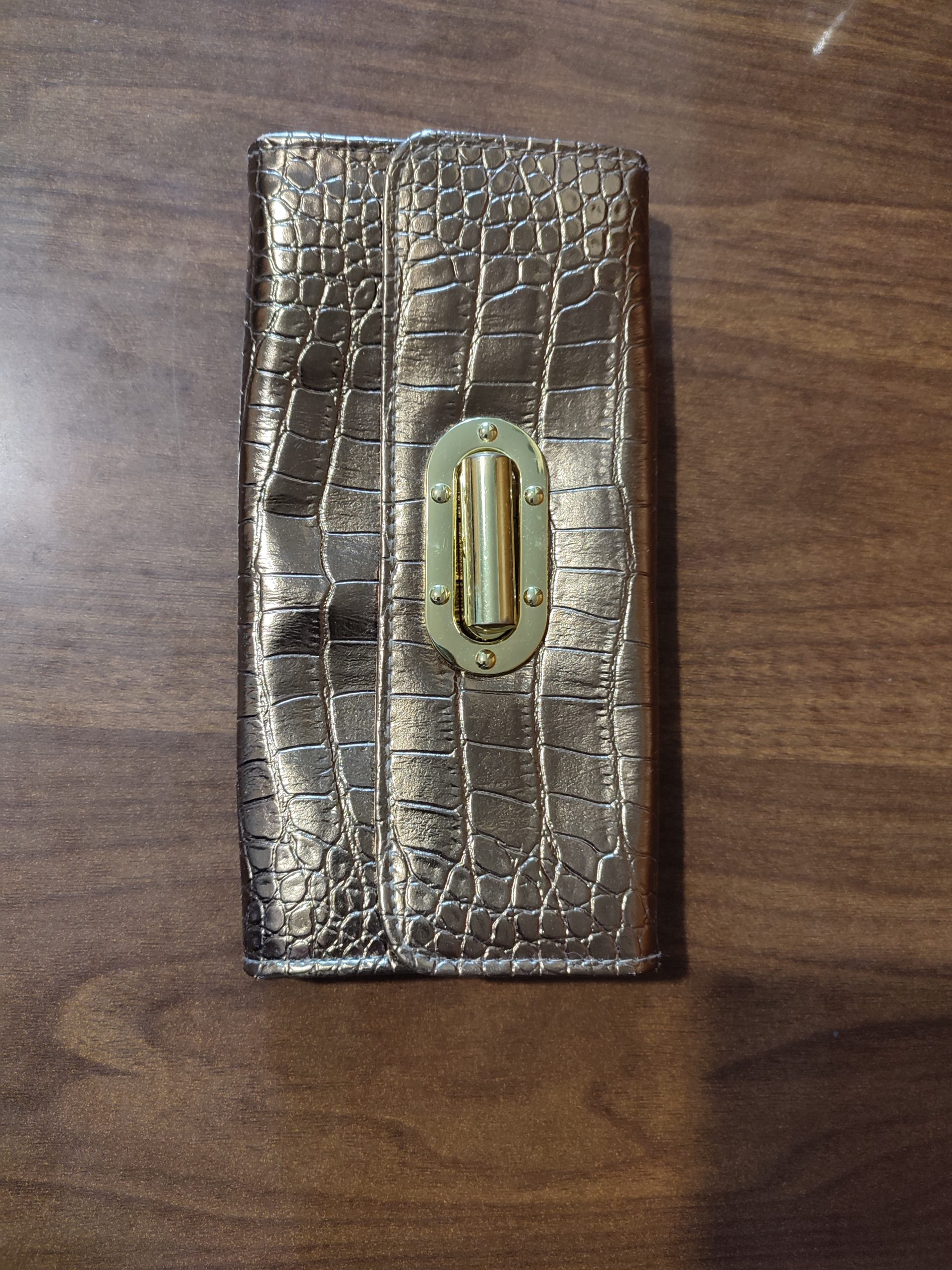 Вместительный, новый женский кошелёк из искусственной кожи, рисунок под крокодила. На передней части массивная винтовая металлическая "закрывашка". Внутри несколько отделений, для мелочи на молнии, кармашки для кредитных карт