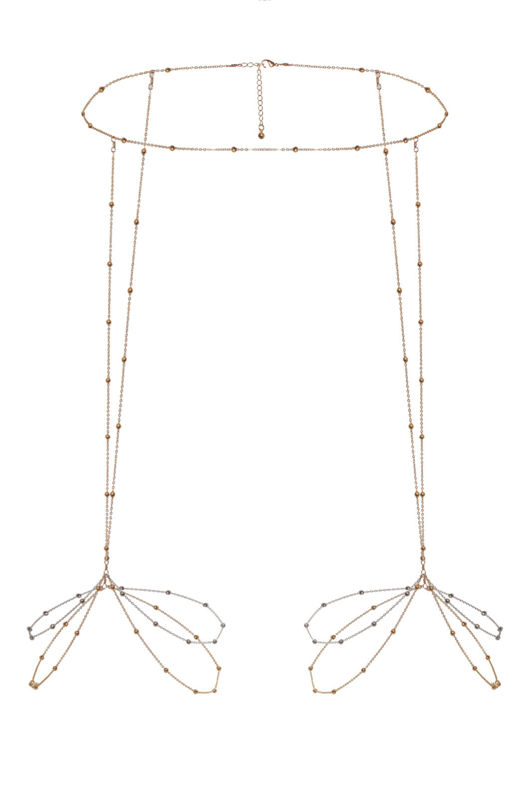 Биколорное украшение (переплетение цепей золотого и серебряного цвета) - цепь на тело. Регулируется по обхвату талии, застежка-карабин.