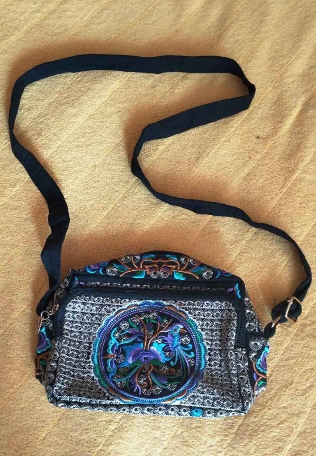 Сумочка на длинном ремне. Привезена из Индии - отсюда расцветка такая интересная. Размер небольшой, но кошелёк, телефон и ещё что-то поместится. Можно для косметики использовать.