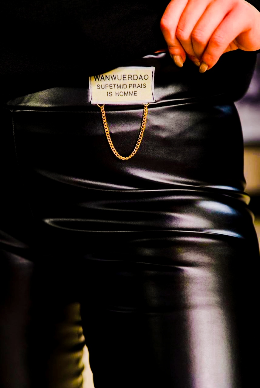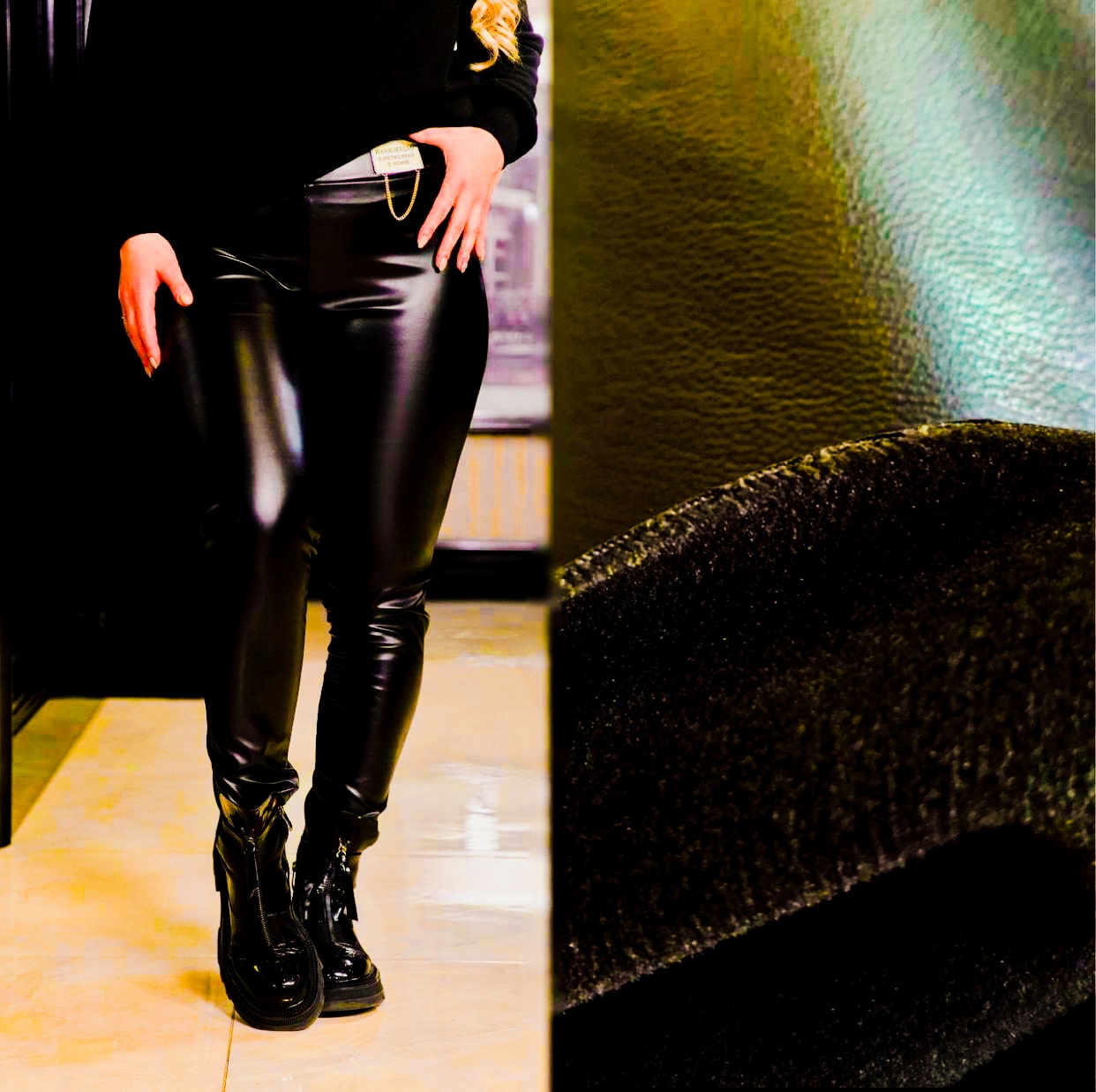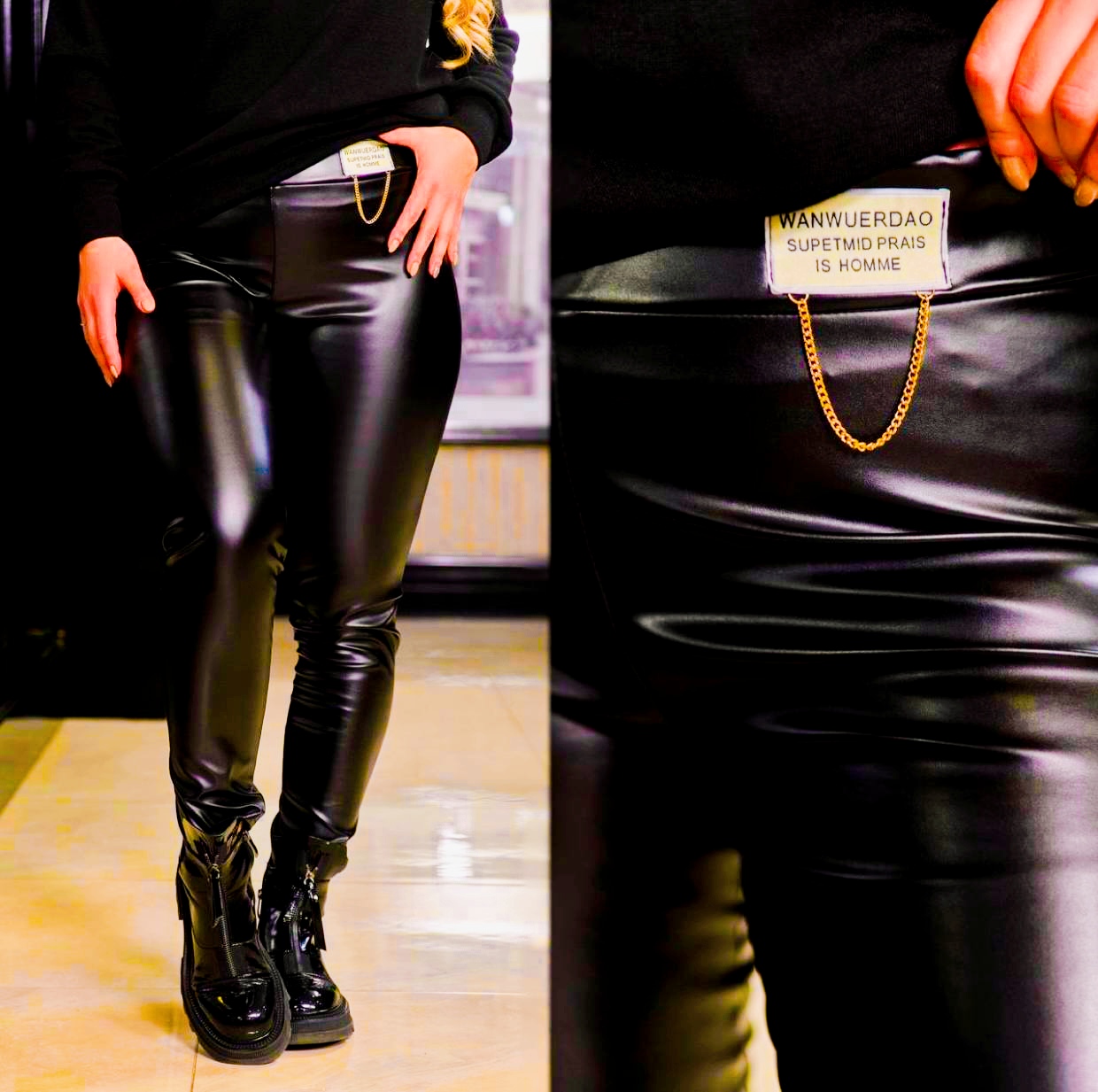 Лосины чёрного цвета с украшением - цепочкой. Изготовленные из эко-кожи на велюре, имеют хорошую растяжимость.
