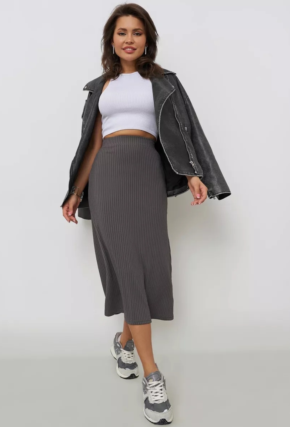 Юбка женская миди из ткани лапша. А-силуэт, высокая посадка, пояс на резинке, цвет графит, размер 42-46.