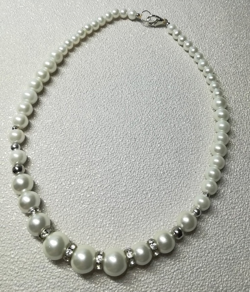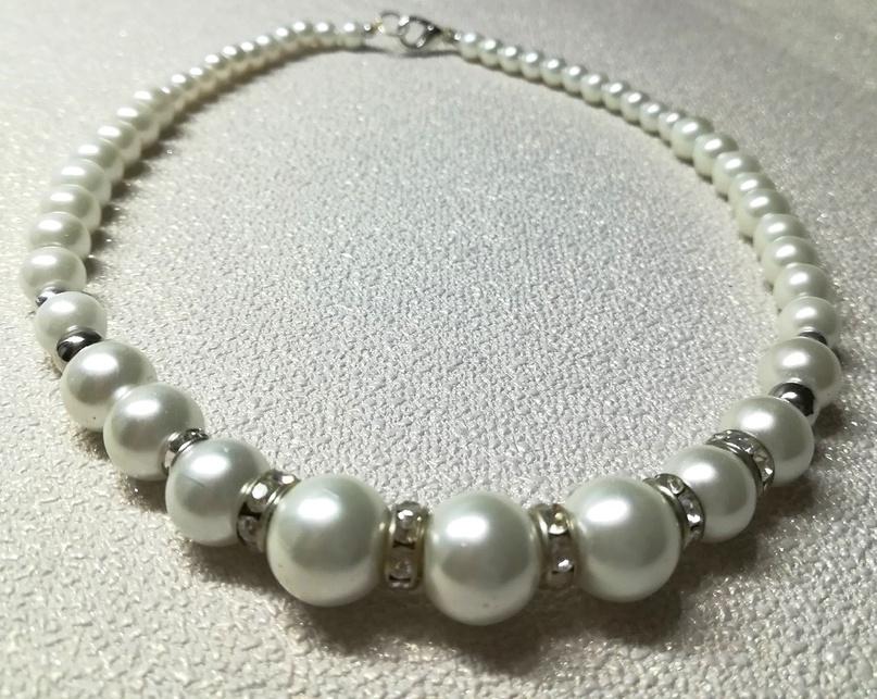 Чокер из разных по размеру бусин искусственного жемчуга Майорка. Между крупными бусинами впереди чокера разделители с горным хрусталем.