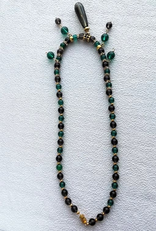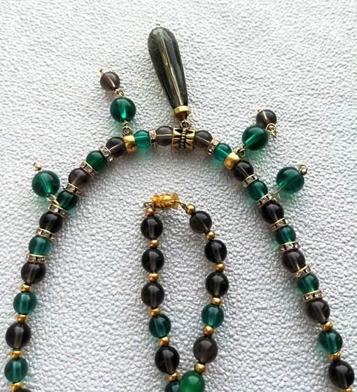 Колье из бусин дымчатого кварца и стеклянных бусин зеленого цвета украшено крупной бусиной капля из кварца. Фурнитура золотистого цвета, замок винтовой