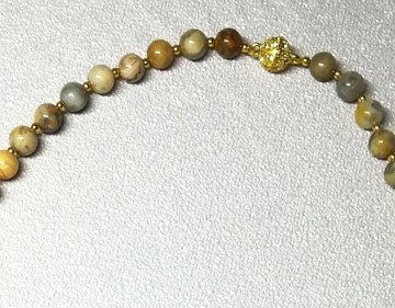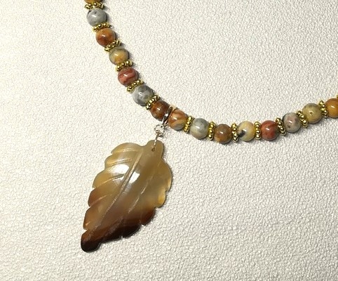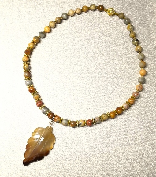 Золотистые разделители украшают колье из бусин кружевного агата. Колье украшает крупный резной лист из сердолика. Сзади магнитная застежка золотистого цвета со стразами.