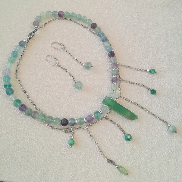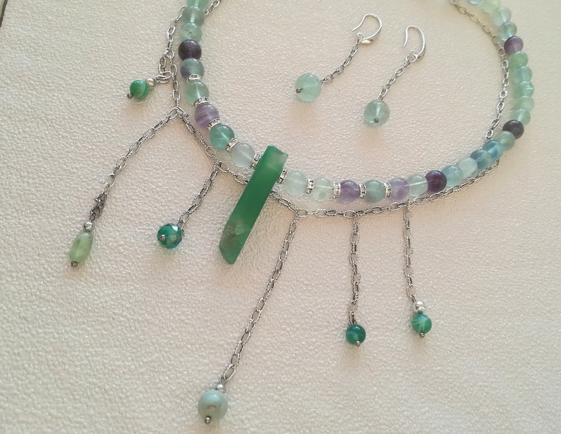 Комплект из чокера и сережек. На чокере из флюорита впереди находится подвеска-палочка из зеленого агата. Бусины флюорита разделены ронделями серебристого цвета с кристаллами. На втором ряду чокера серебристая цепочка с подвесками из разных бусин: пренита, окаменелого дерева, зеленого агата и хрусталя. Сережки из бусин флюорита на цепочке. Вся фурнитутра серебристого цвета