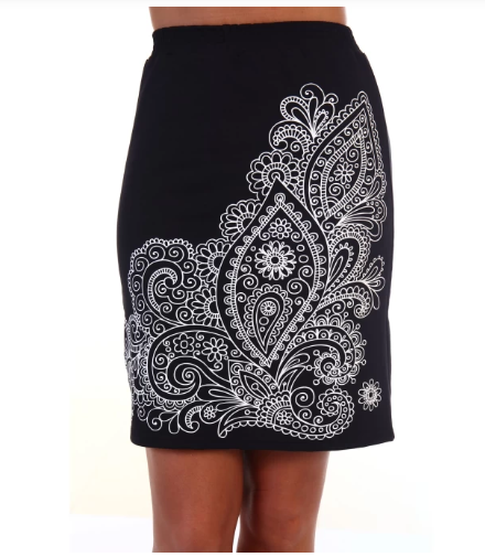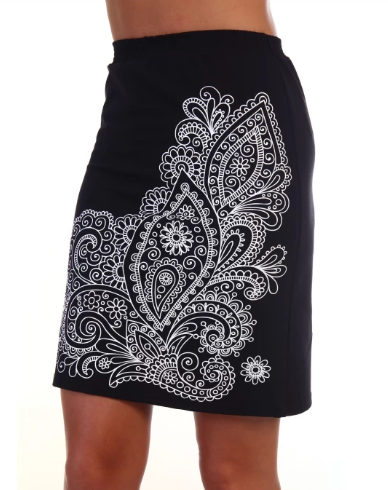 Классическая женская юбка с оригинальным принтом. Материал футер с добавлением лайкры, поэтому юбка хорошо держит форму. Размер 48-50. Цвет черный, рисунок только спереди.
