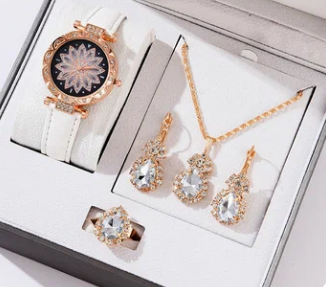 Женские универсальные наручные часы с браслетом и цепочкой, серьги и кольцо в комплекте.