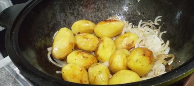 • Тем временем порежь лук на тонкие полукольца. Шумовкой достань картофель, а на оставшемся масле обжарь лук. Возврати картофель в казан, поместив его на луковую подушечку.