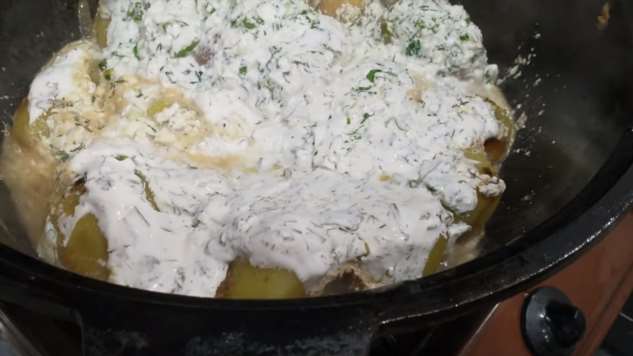 • Выложи сметанный соус на картошку и дай постоять в разогретом казане пару минут. Потом размешай совместно с картошкой и луком.