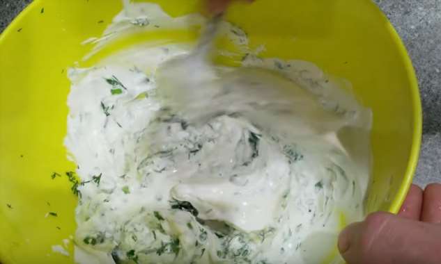 • Мелко порежь зеленоватый лук, петрушку и укроп. Посоли и добавь сметану. Перемешай зелень со сметаной в однородную массу.
