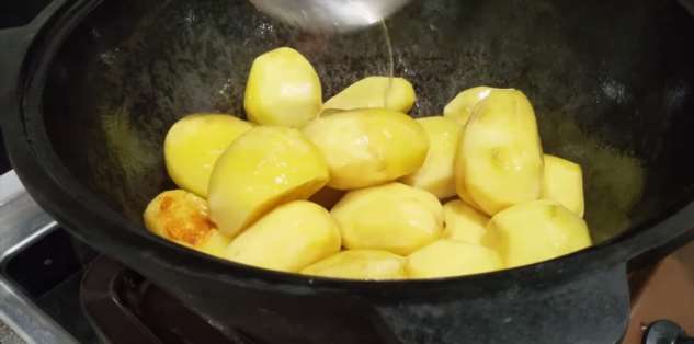 • Налей в казан растительное масло и сделай средний огнь. Не стесняйся, масла обязано быть достаточное количество. Обжарь очищенный, но не порезанный картофель в протяжении 5 минут, до возникновения корочки.