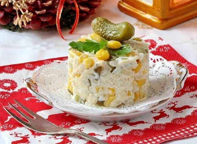 Попробуй варьировать свое новогоднее меню салатом с рисом, сыром и маринованными огурцами. Сочетание товаров непривычное, но салат различается особенной сытностью. Даже маленькая порция принесет приятное чувство насыщения.