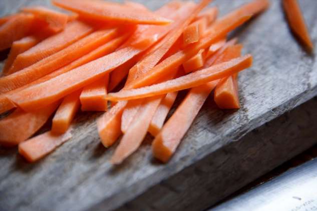 • Слегка обжарьте орешки на сухой сковороде. Морковь разрежьте вдоль на четвертинки. Разогрейте духовку до 200 градусов.