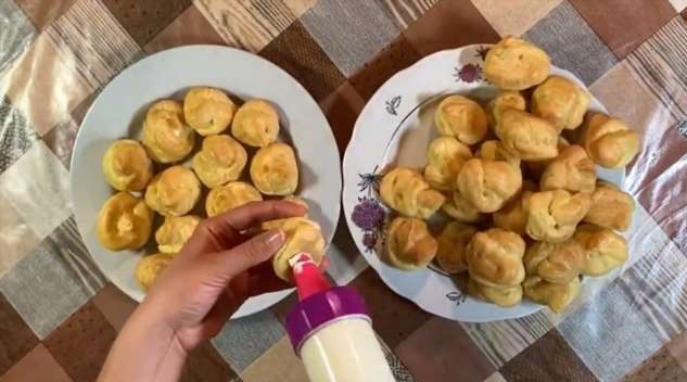 - Собери с противня выпеченные и остуженные эклеры. Надрежь любой ножиком приблизительно до середины и начини творожным кремом при помощи шприца либо ложечкой.