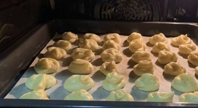 - Застели противень пергаментной бумагой. Она предупредит пригорание выпечки. В предстоящем нужно маленькими порциями выложить тесто на противень. Легче всего это созодать с помощью кондитерского шприца, хотя если на твоей кухне такой отсутствует, ты можешь пользоваться 2-мя чайными ложками. Твоя цель — выложить шарики из теста.