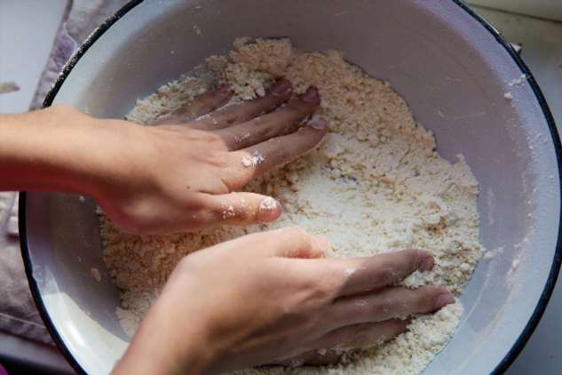 Потом добавь в миску воду и сформируй из теста один однородный шар.