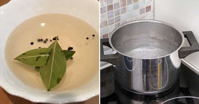 - Сделай рассол: вскипяти 0,5 л воды, добавь соль, сахар, положи перец и лаврушку. Остуди.