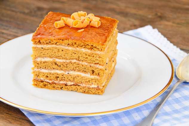 Медовик с заварным кремом — ласковый, в меру сладкий, совершенно смешивается с благоуханным утренним кофе. Именуется тортик «Медовая губка», поэтому что отлично пропитывается, а любой кусок моментально тает во рту.