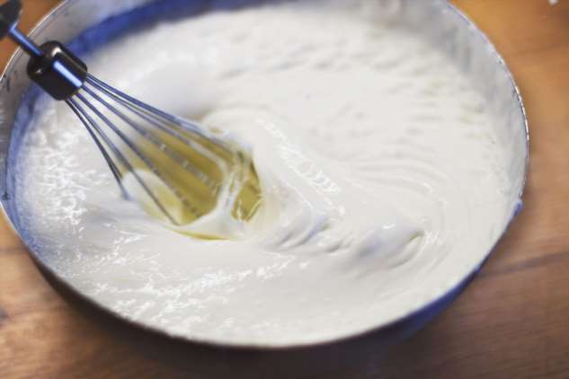 - Просей муку и размешай ее с теплой яичной консистенцией.