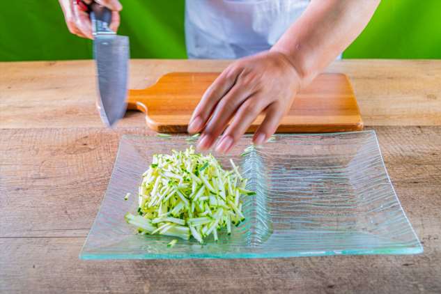 - Промой огурцы и порежь соломкой совместно с кожицей.