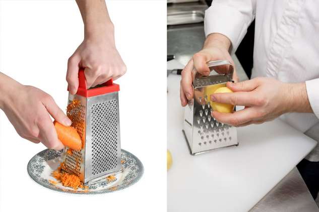 • Сперва натираем очищенную морковь на маленькой терке и отправляем в миску. Картофель натираем на большой, но, так как он выделяет много сока, помещаем его в отдельную емкость. Выжимаем сок и перекладываем картошку к моркови.