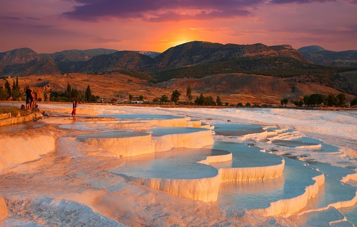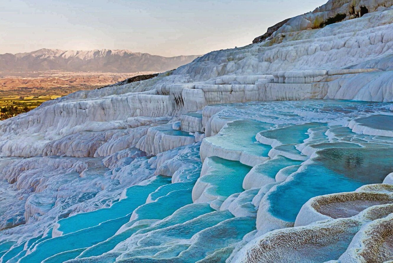 Памуккале - это даже не географическое название, а уникальное явление природы. Это красивое место состоит из белоснежных террас, образовавшихся из накопления известняковых отложений в течение тысячелетий. Вода, богатая минералами, стекает по террасам, образуя термальные источники и каскадные бассейны.