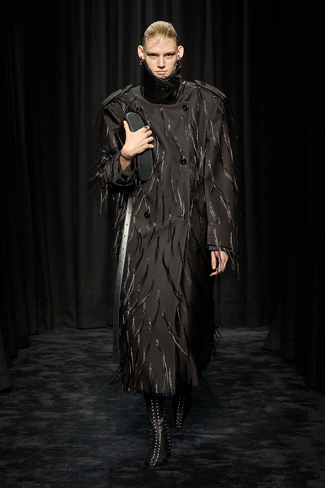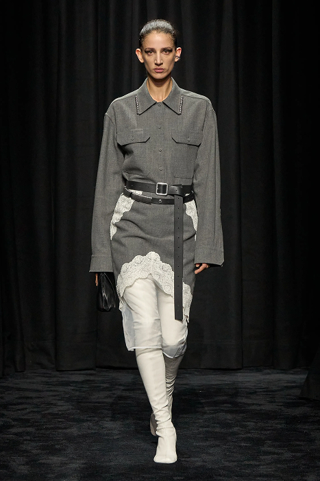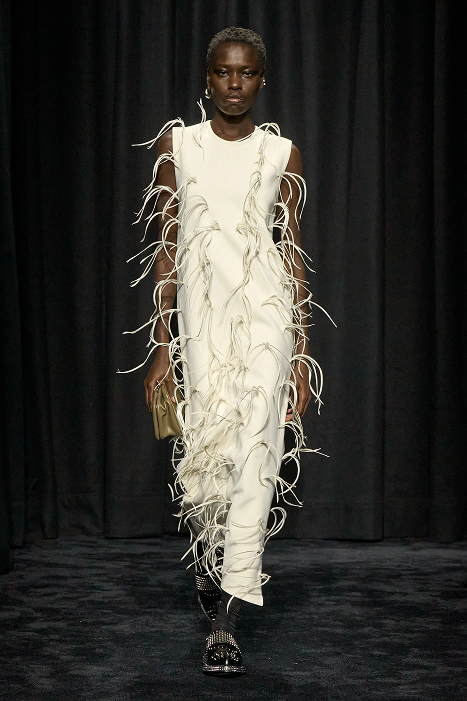 Уход от Jil Sander фиксируется в коллекции, которая отличается панковым, но декадентским настроением, совсем иной, чем ранее. Показ открылся черным бюстье-платьем с бахромой и шипованными лоферами, дополненными повязками на бедрах и грубыми ремнями, подчеркивающими талии моделей.