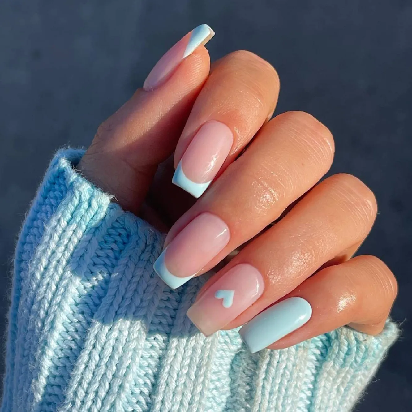 Френч с baby blue: Используйте нежно-голубой цвет вместо традиционного белого для создания френча. Это придаст вашему маникюру современный вид.