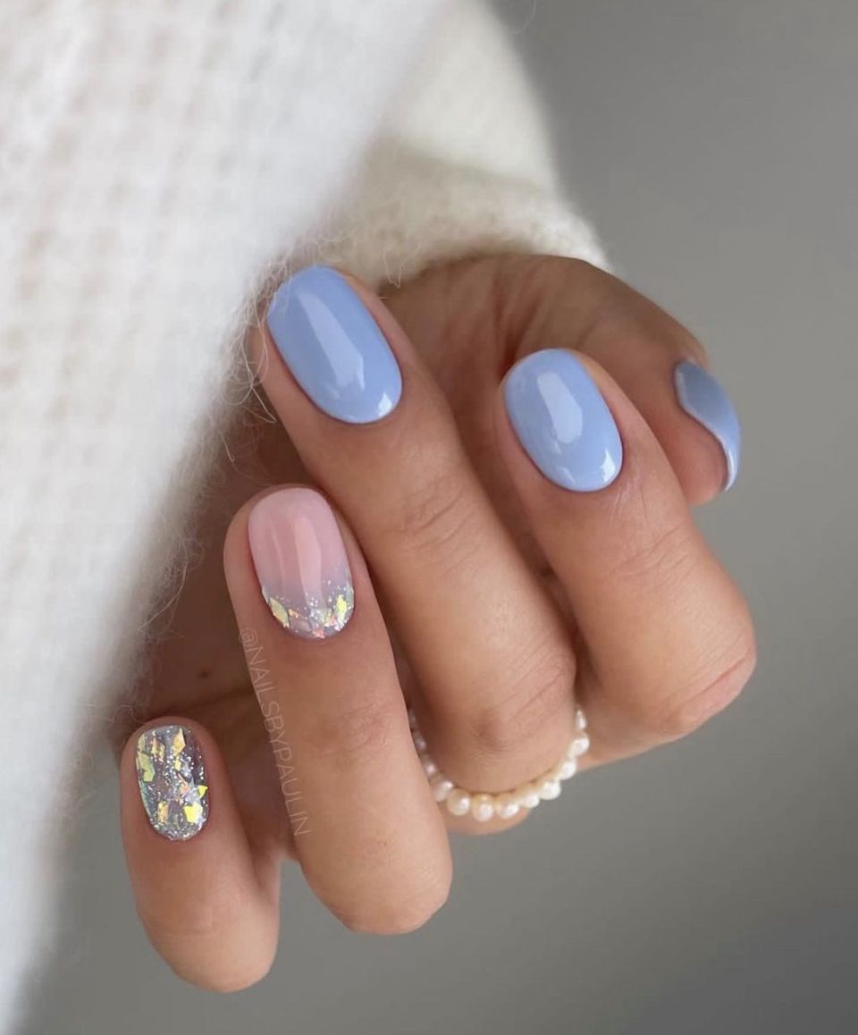 Комбинация с другими цветами: Сочетайте baby blue с пастельными оттенками, такими как розовый или мятный, для создания яркого и игривого маникюра.