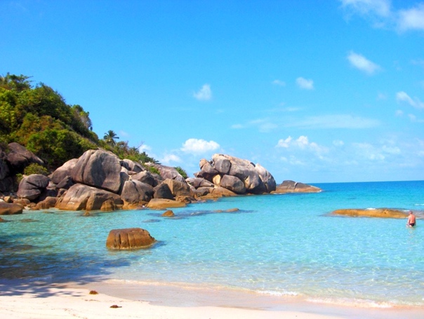 1. Красивая природа: - Пляж окружен зелеными холмами и камнями, создавая живописный фон для отдыха. Песок светлый и мягкий, а вода имеет яркие бирюзовые оттенки.
